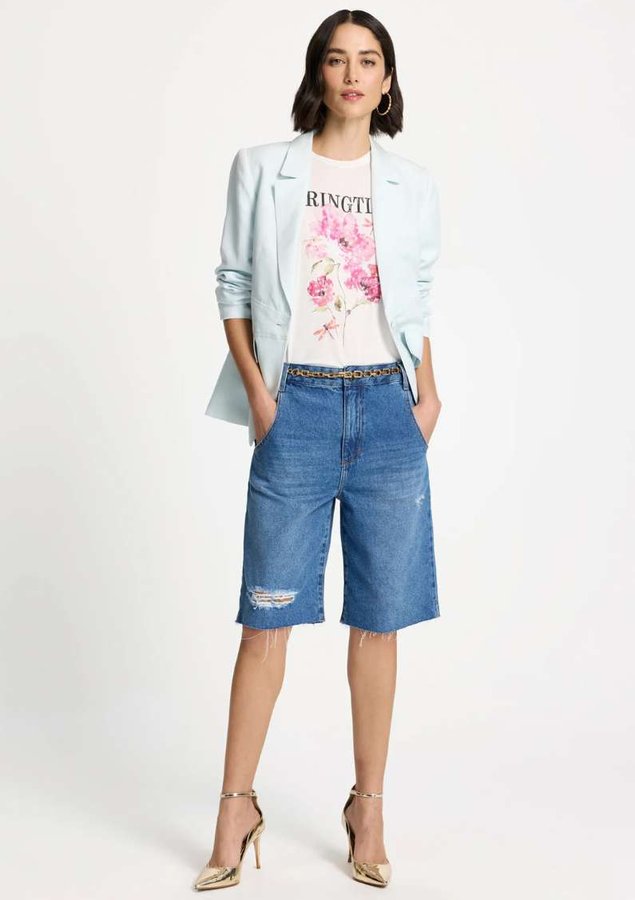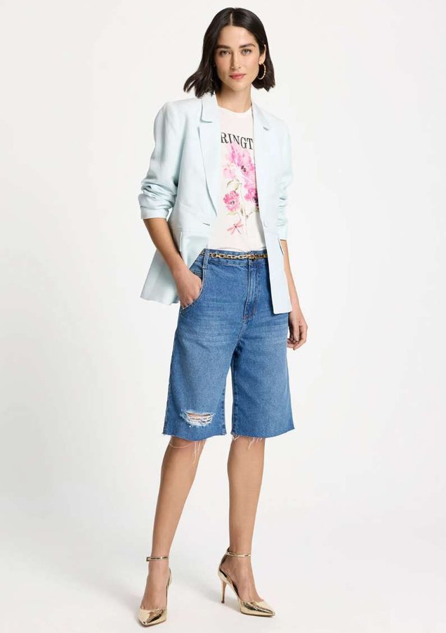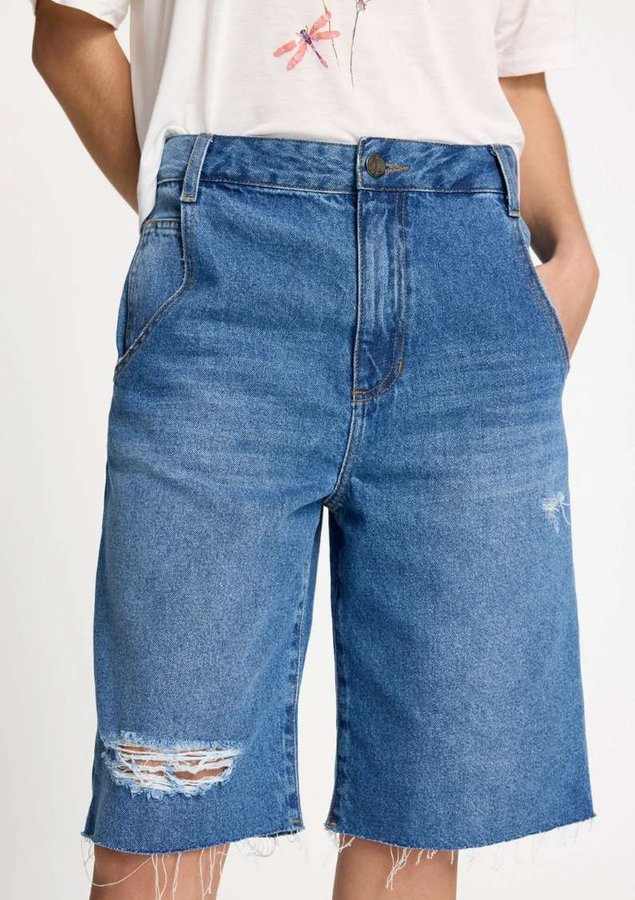 Confeccionada em jeans de lavagem média, a Bermuda possui modelagem reta, cós com passantes, fechamento por botão e zíper, cinco bolsos, detalhe destroyed, barra desfiada, bolsos posteriores com efeito contrastantes e acabamento pespontado.