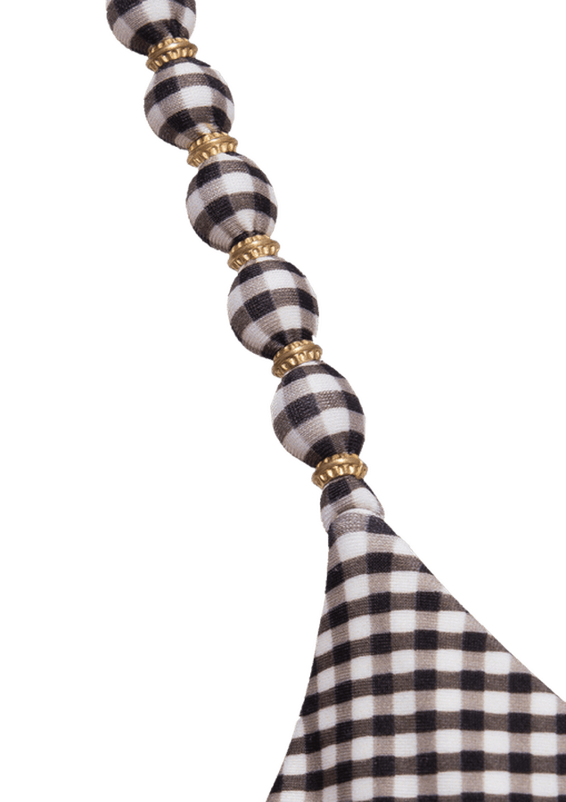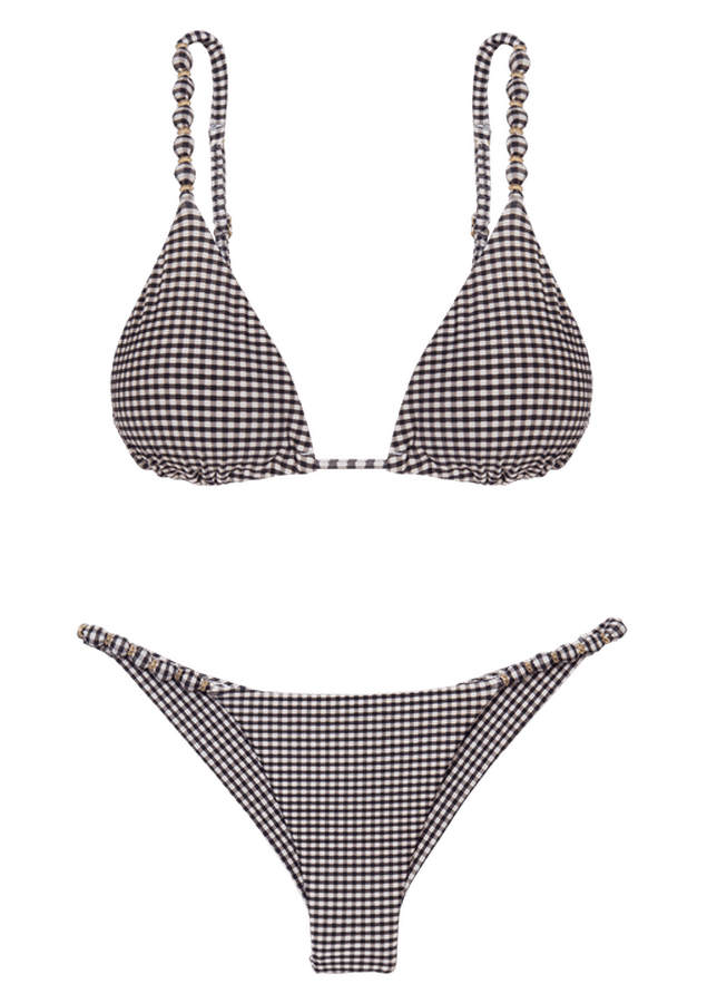 Modelo icônico best-seller ViX: top triângulo ajustável, alças paralelas com contas revestidas pelo próprio tecido, arrematadas pelos acessórios em metal. Bojo removível, amarração nas costas, cobertura pequena. Lupita é um tradicional Vichy versão minimal em preto e off white. Todos os metais dos sofisticados aviamentos ViX têm banho de ouro.