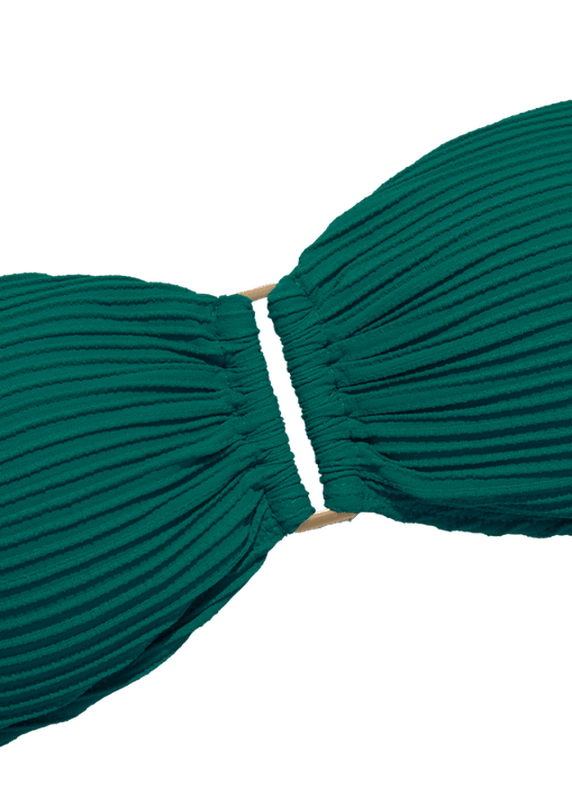 Top com alças reguláveis e removíveis, detalhe de metal retangular vazado no centro do busto. Amarração nas costas, bojo fixo, cobertura grande.