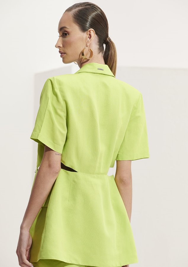 Blazer possui gola com lapelas, mangas curtas, abertura frontal com botões e detalhes em recortes da cintura.