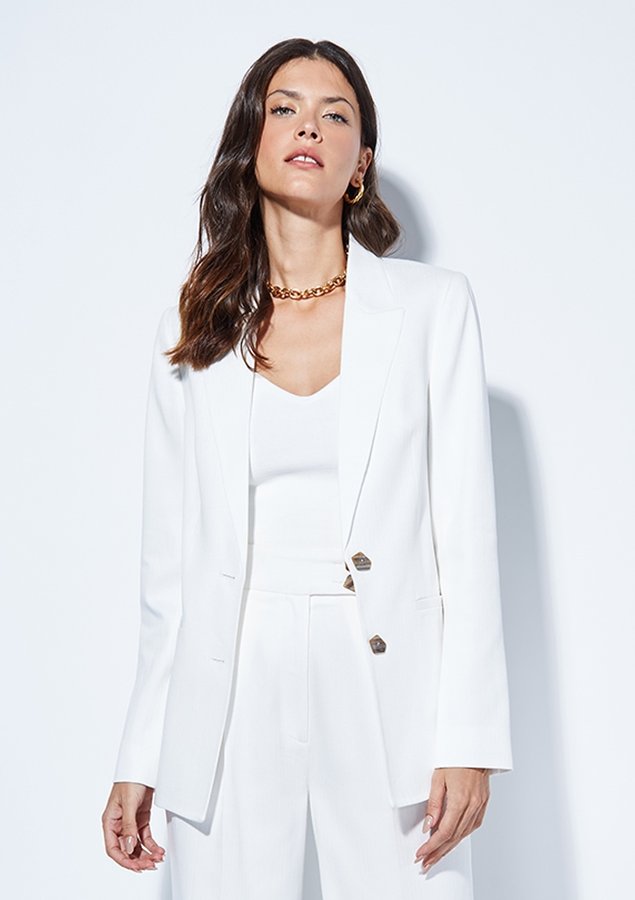 A terceira peça é ideal para garantir elegancia e sotisticação na hora de compor um look. Aposte no Blazer Dara em um visual all white combinando com calça de alfaiataria da mesma coleção.