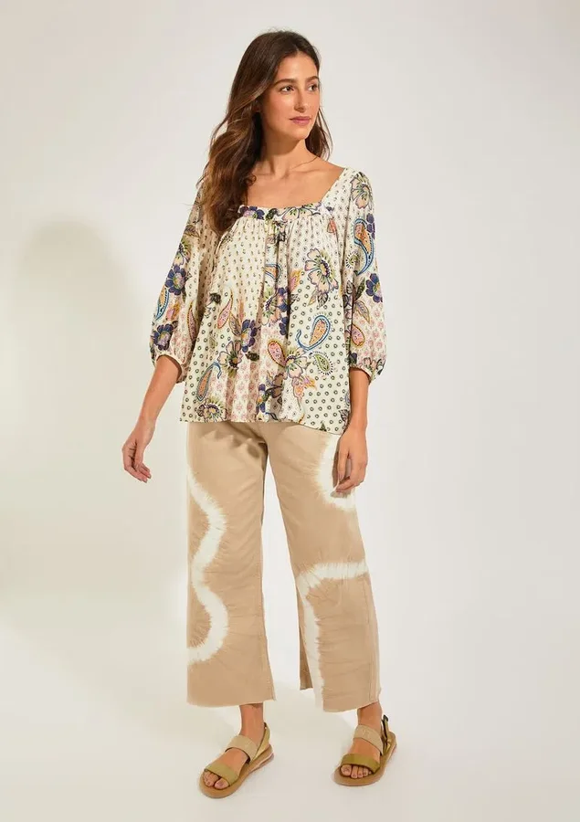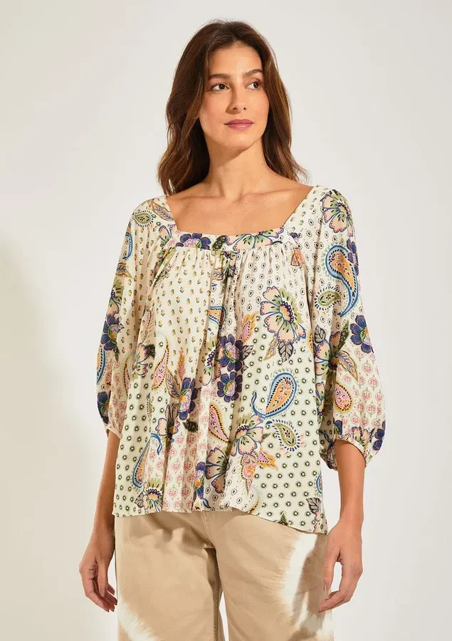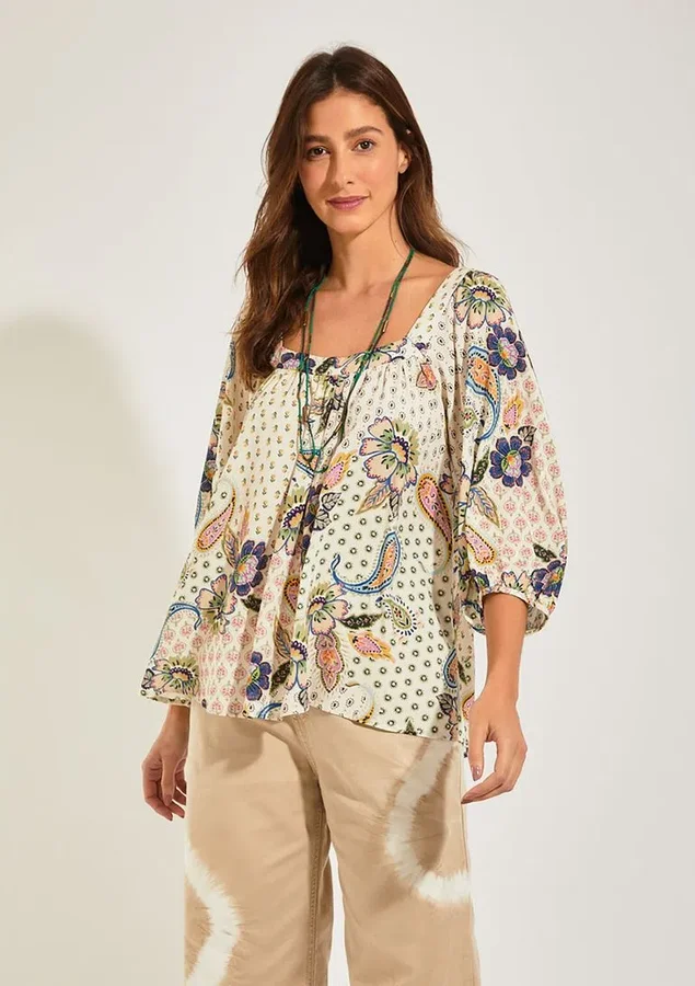Blusa com estampa Nirvana, destaque na coleção. O modelo possui mangas amplas e decote quadrado.