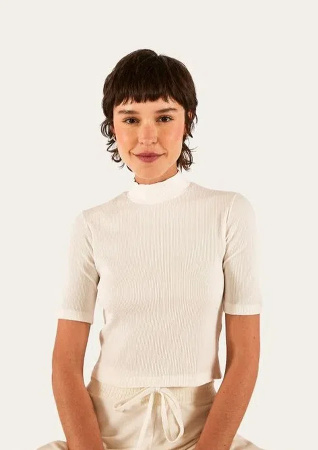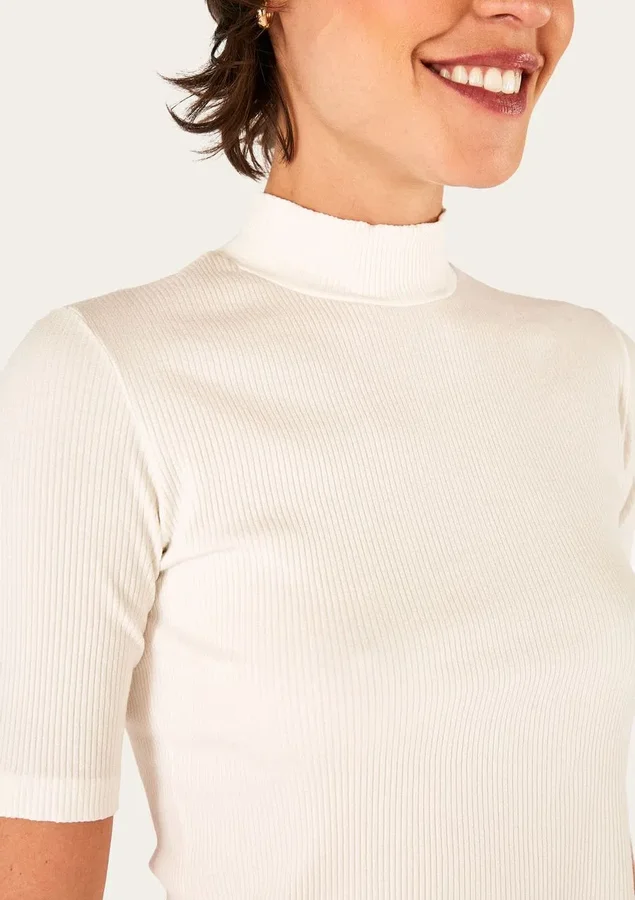 blusa de golinha alta e manguinhas curtas. o modelo é reto de malha canelada.