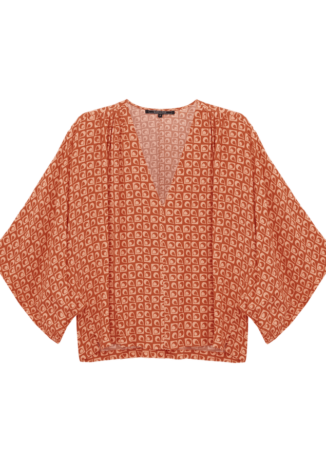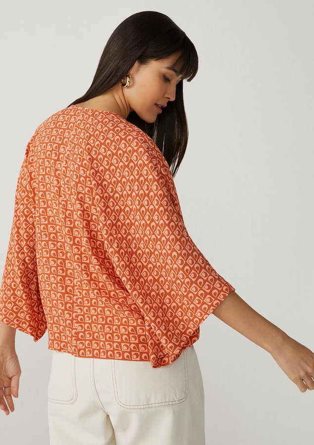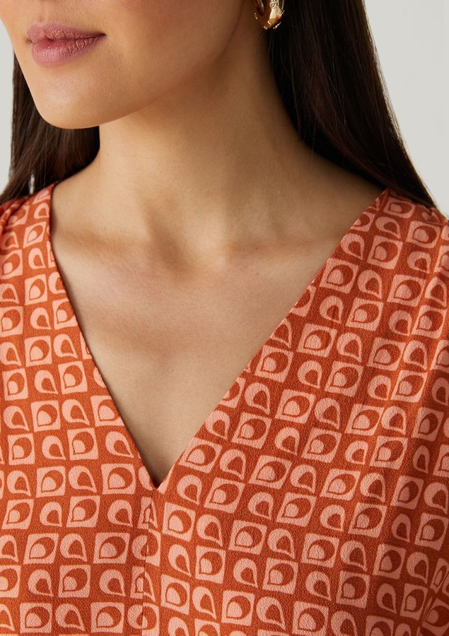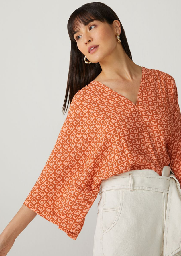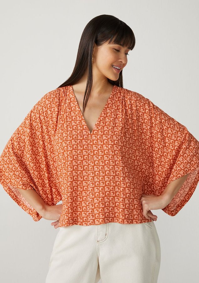 Blusa, comprimento médio, manga curta kimono, modelagem reta, decote V leve franzido no ombro e fenda lateral .