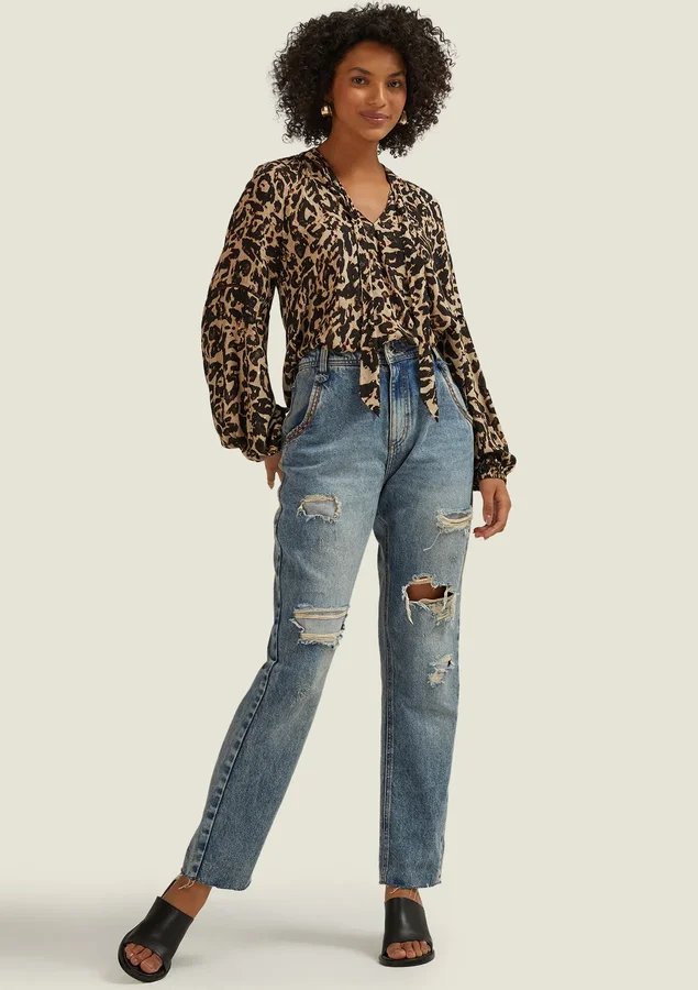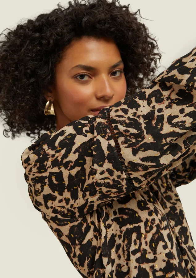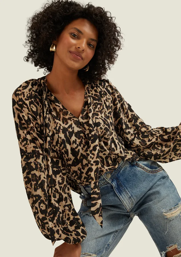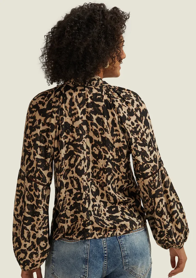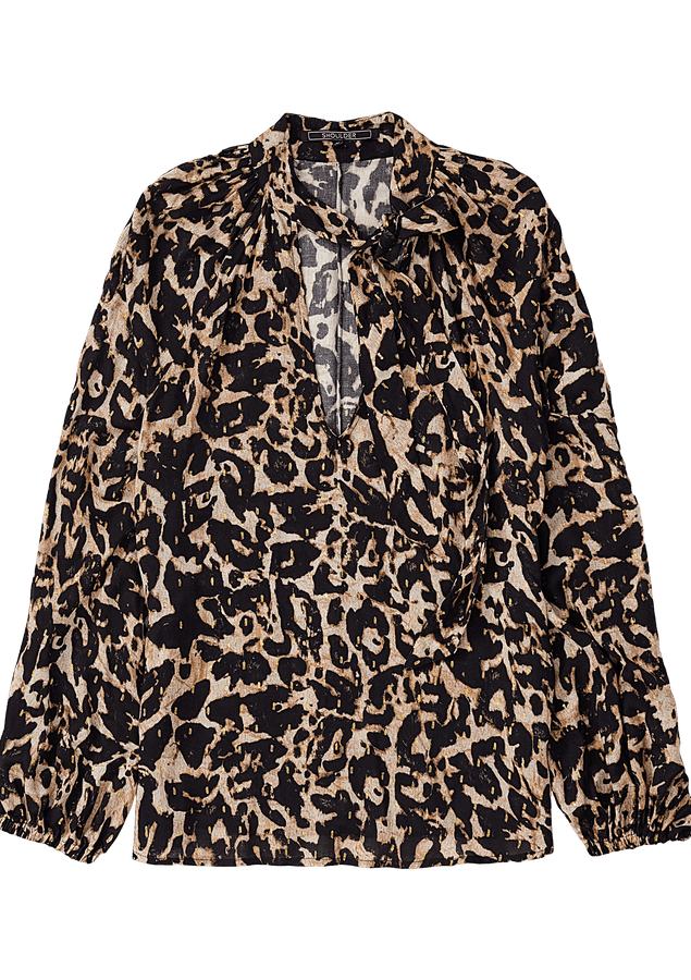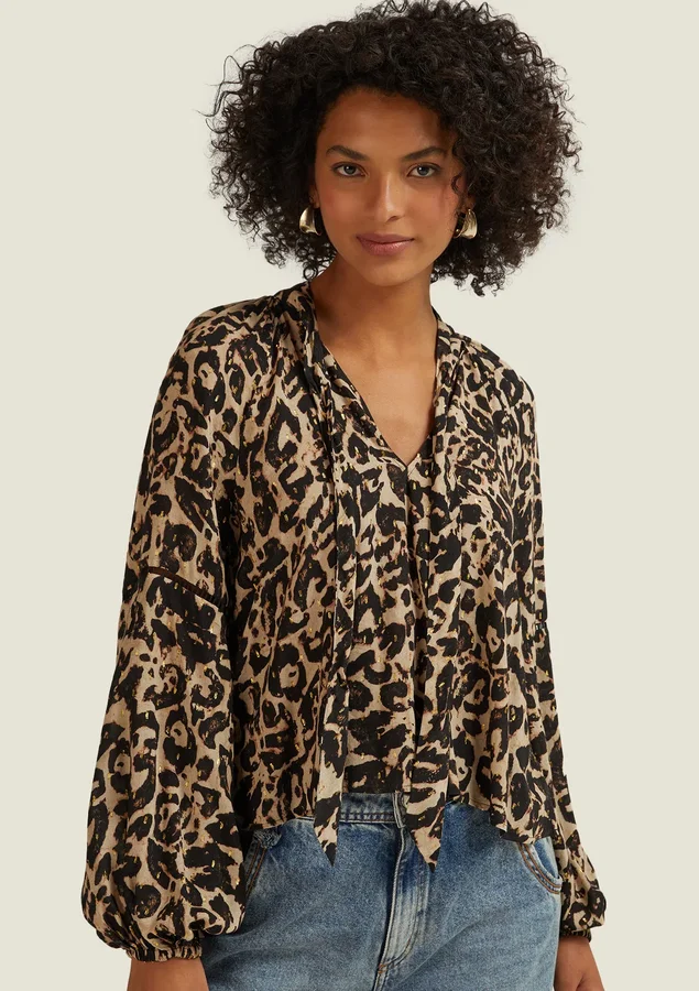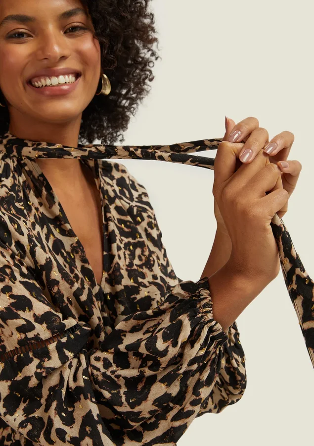 Blusa Comprimento médio, Manga longa, Modelagem ampla, Tecido: Viscose leve com fio metalizado, Decote V, Gola com faixa para amarrar, Fendas laterais e Manga com punho de elástico.