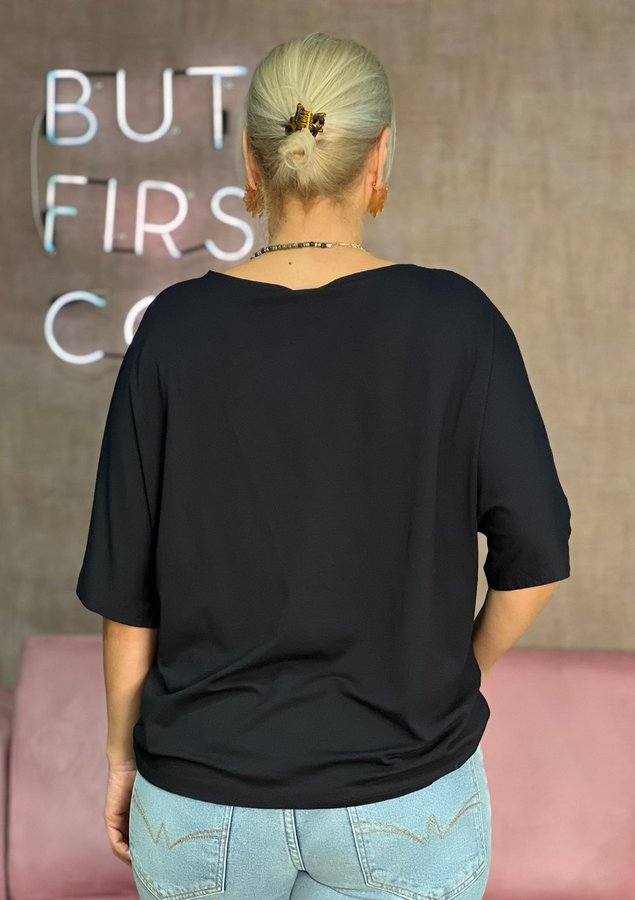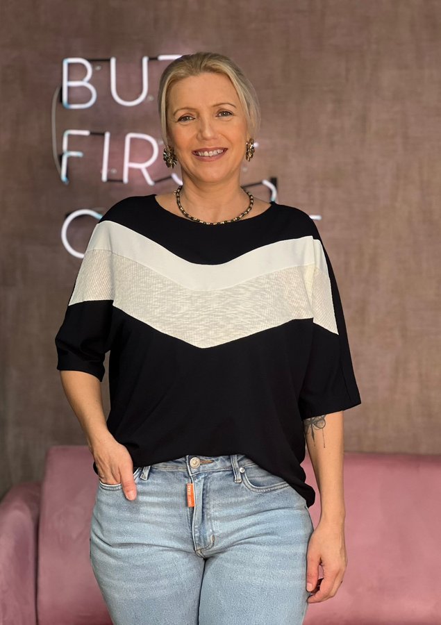 A frente da blusa é adornada com detalhes em off-white que adicionam um toque de sofisticação e contraste ao design. Esses recortes destacam-se com elegância no fundo preto. O comprimento médio desta blusa é perfeito para ser usado tanto dentro quanto fora da calça ou saia. Ele proporciona versatilidade no seu estilo, permitindo que você a combine de várias maneiras.