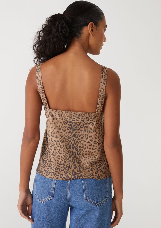 Regata Comprimento médio, alça larga, modelagem reta, decote V, recortes pespontados , fendas laterais em malha suede.