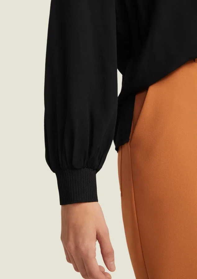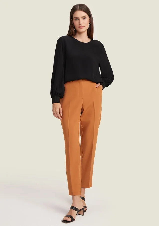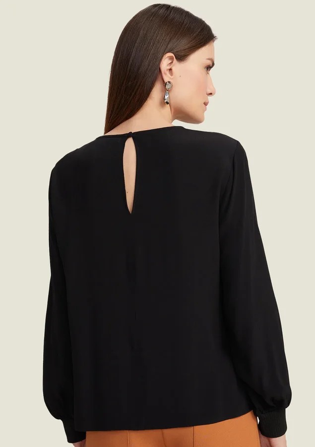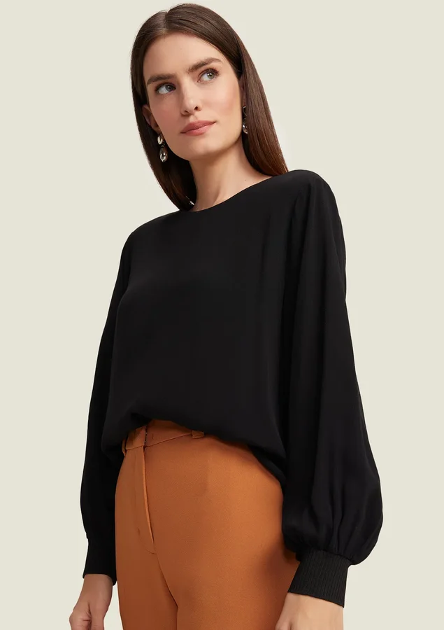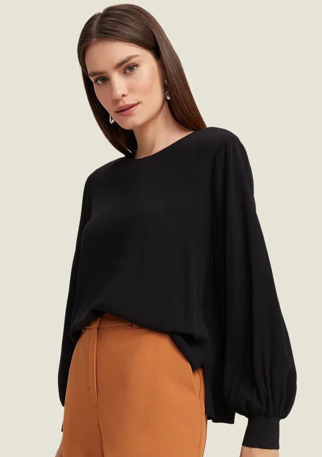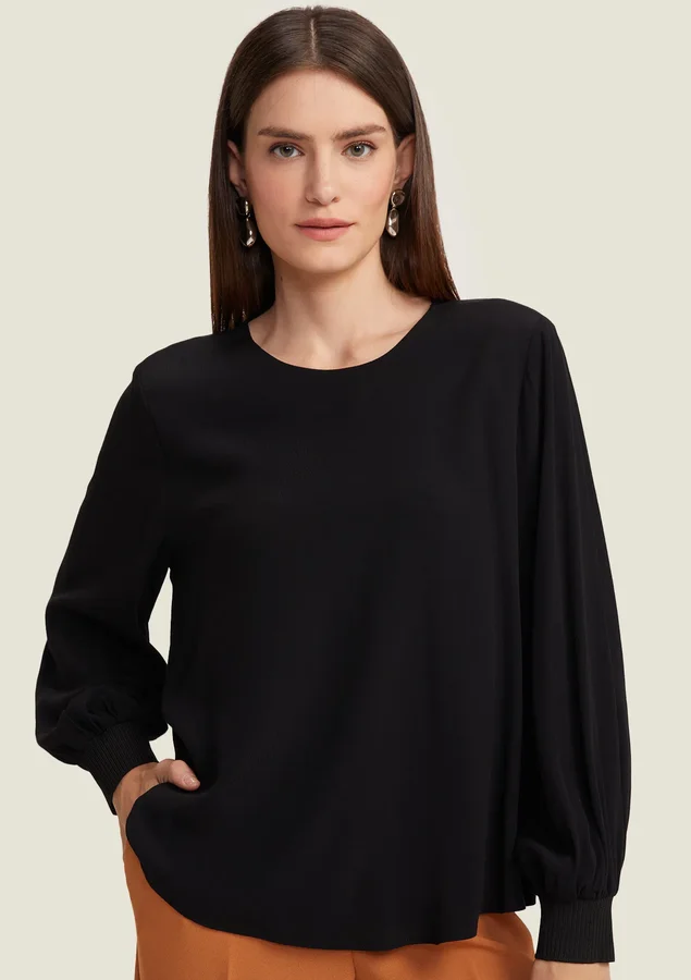 Blusa Comprimento médio, Manga 7/8, Modelagem reta, Tecido: Crepe leve, Decote redondo, Punho com retilínea, Fendas laterais, Fechamento com botão forrado no decote costas.