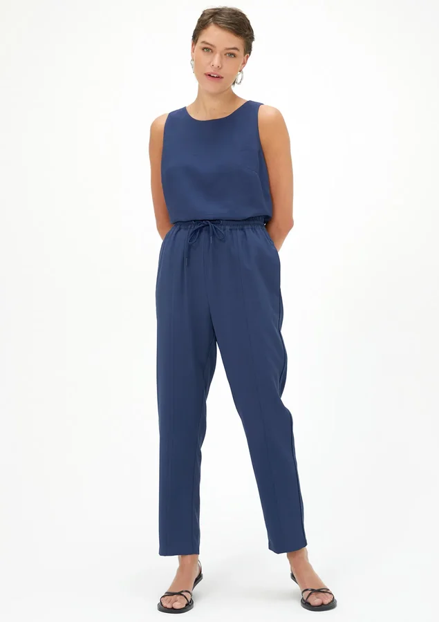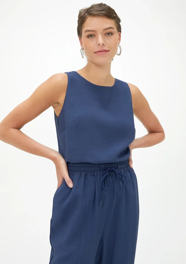 Blusa comprimento médio, modelagem reta, sem manga, decote canoa, tecido: alfaiataria fluida lavada, fendas laterais de 10 cm.