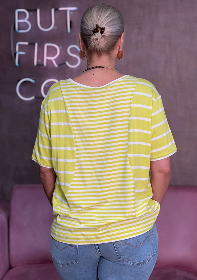 Um toque de estilo descontraído e elegância ao seu guarda-roupa com esta blusa excepcional. Com mangas curtas, uma gola redonda clássica e uma modelagem ampla e confortável, esta blusa é a escolha perfeita para diversas ocasiões. A característica mais marcante desta blusa são os recortes em tecido listrado de viscose na parte frontal. Esses recortes criam um contraste visual impressionante e adicionam um toque de estilo único à peça.