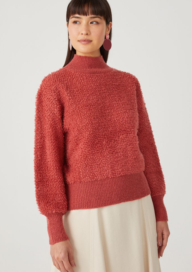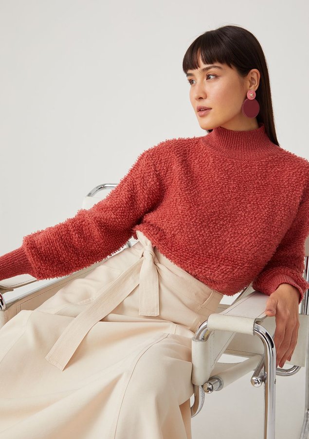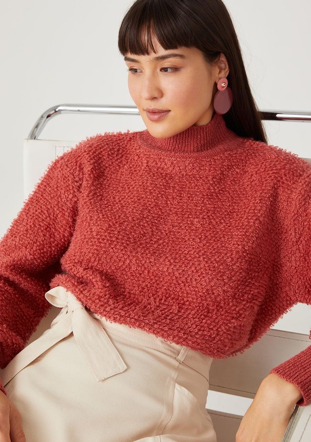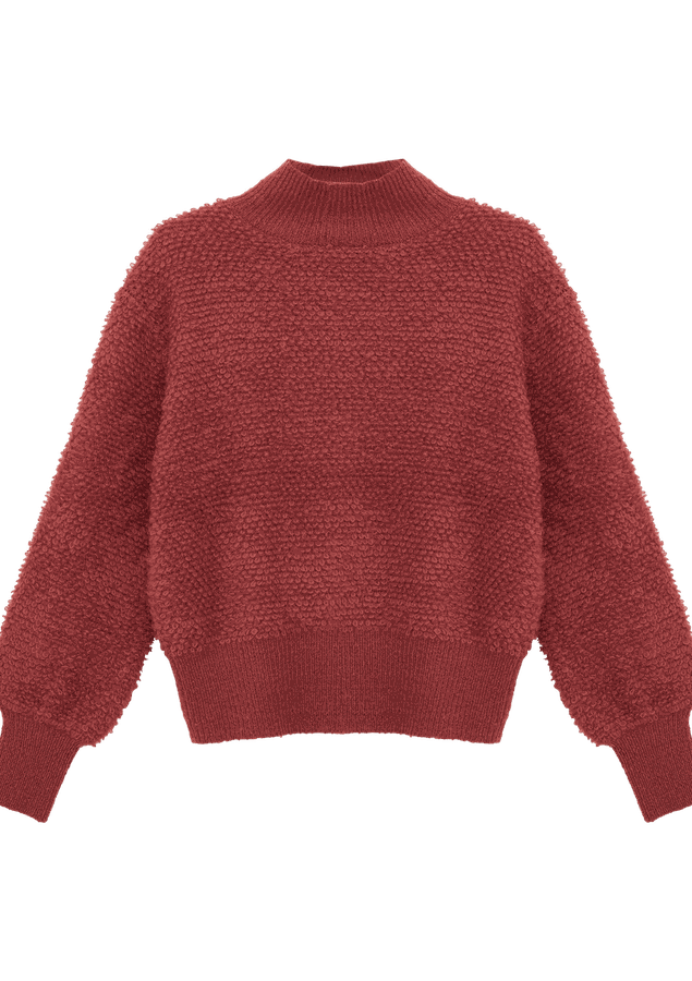 Blusa comprimento médio, manga longa volumosa com punho ajustado, modelagem ampla com barra ajustada, tricot pesado e texturizado com toque macio e gola alta
