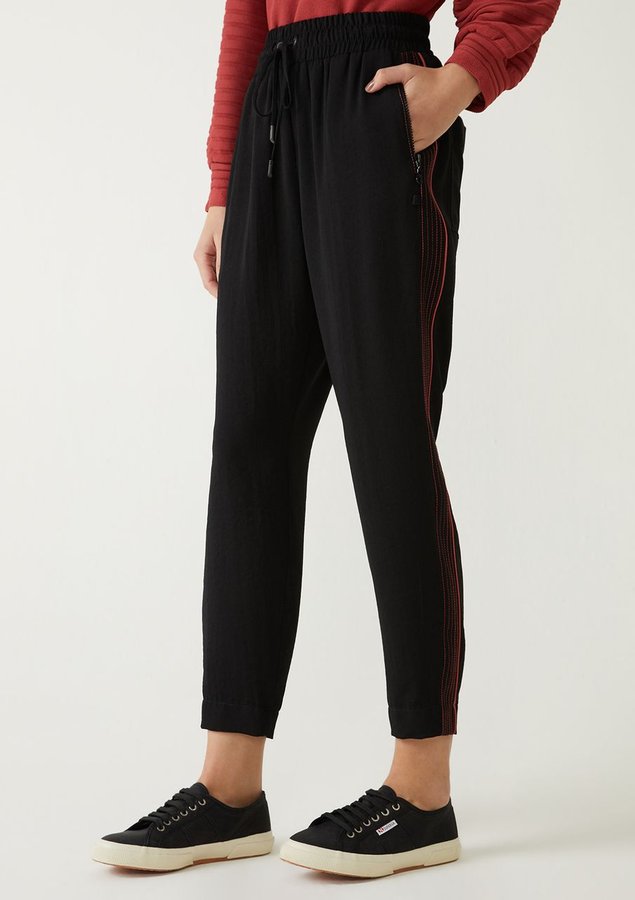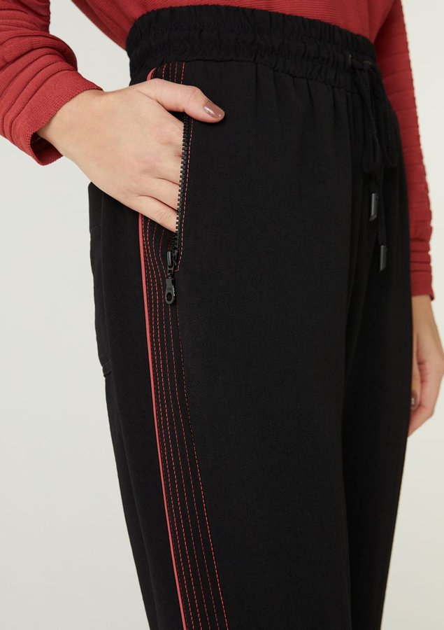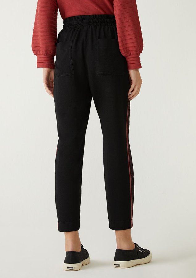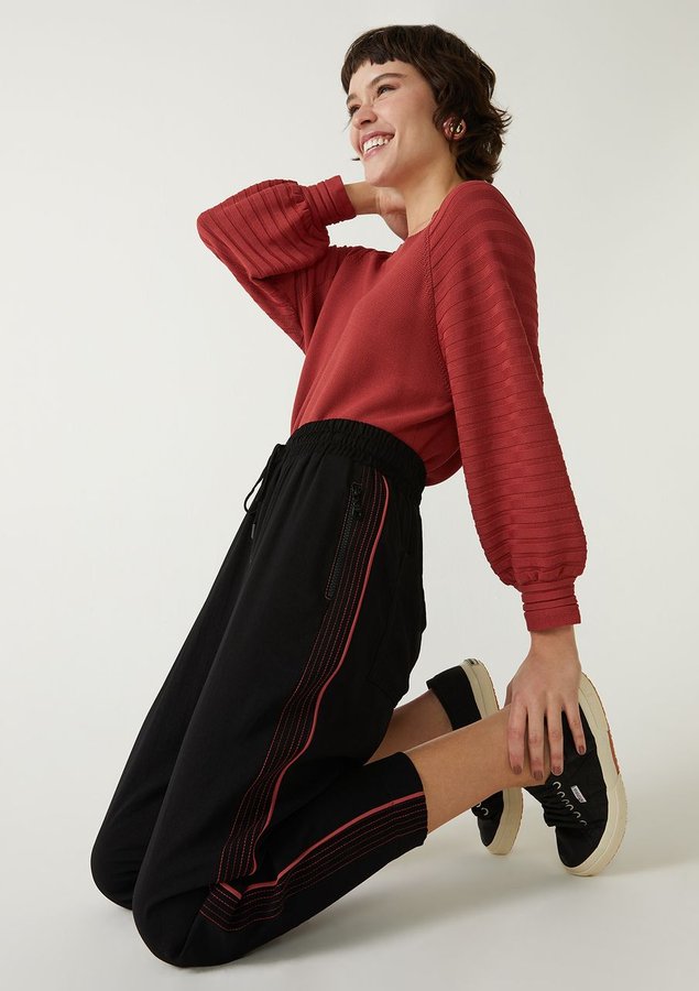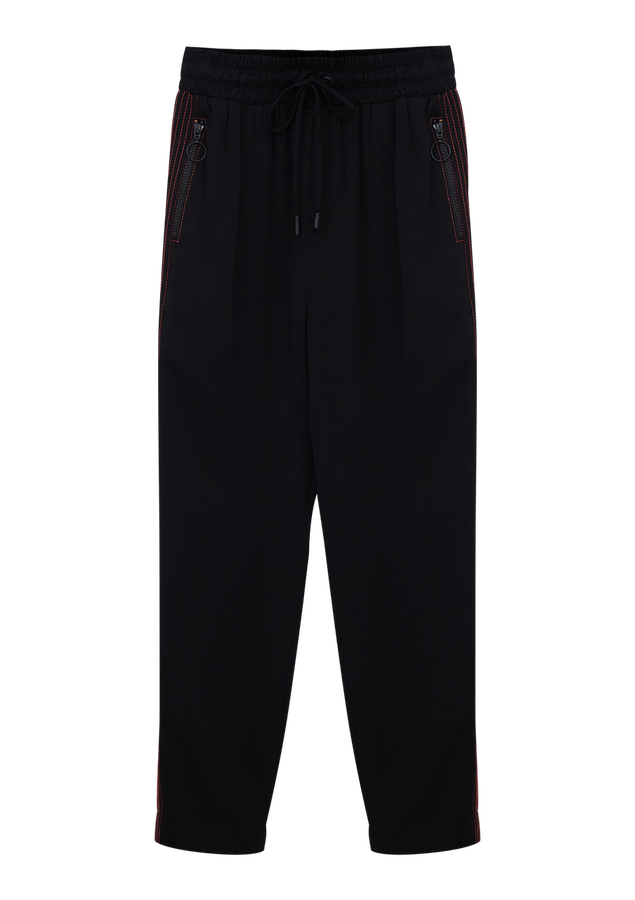 Calça Comprimento longo, Cintura alta, Modelagem afunilada, Cordão para amarrar no cós, Bolsos costas e Bolsos frontais com zíper de nylon.