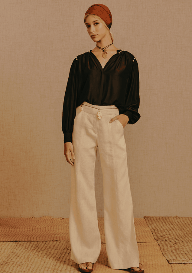 Calça alfaiataria em cambraia de linho, reta, mas com barra levemente aberta. Cós largo, bolso faca, braguilha e recorte lateral.