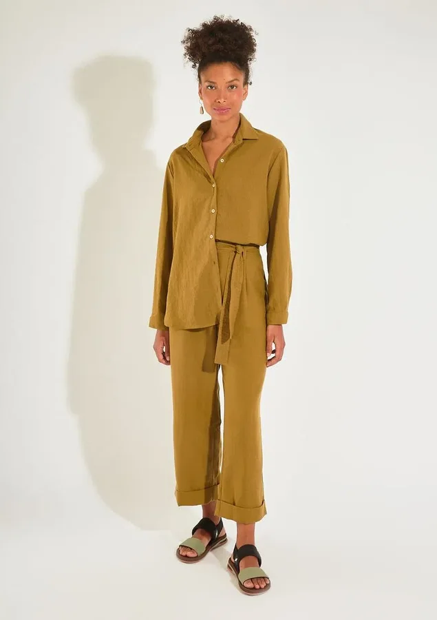 Calça clochard o modelo possui fecho de zíper + botão invisível, bolsos funcionais e faixa para amarração na cintura, modelagem reta com dobra na bainha .