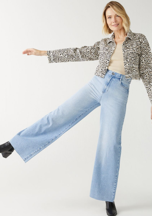 Calça jeans cintura alta modelagem wide, Fechamento braguilha com zíper e botão de metal aparente,