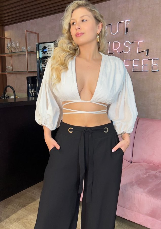 A modelagem pantalona é conhecida por sua fluidez e elegância. As pernas largas proporcionam um caimento perfeito para todos os tipos de corpos. Cordão na parte da frente da calça permite que você ajuste o nível de conforto e acentue sua cintura conforme desejar. O elástico na parte de trás da cintura oferece um ajuste confortável e flexível. Isso significa que você pode desfrutar de total liberdade de movimento e conforto durante todo o dia, sem comprometer o estilo.