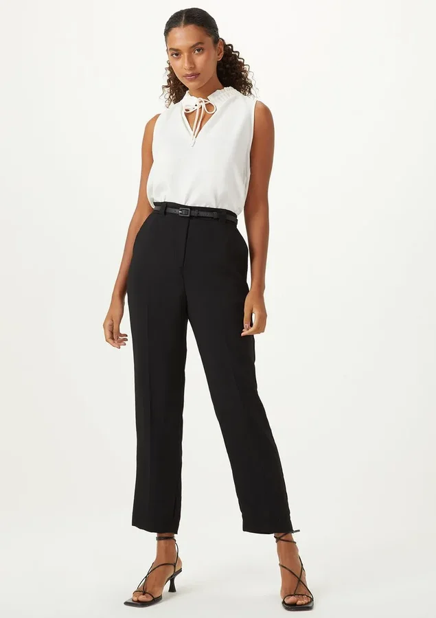 Calça Comprimento longo, Cintura média, Modelagem reta, Fechamento com zíper e colchete gancho, Bolso faca lateral,