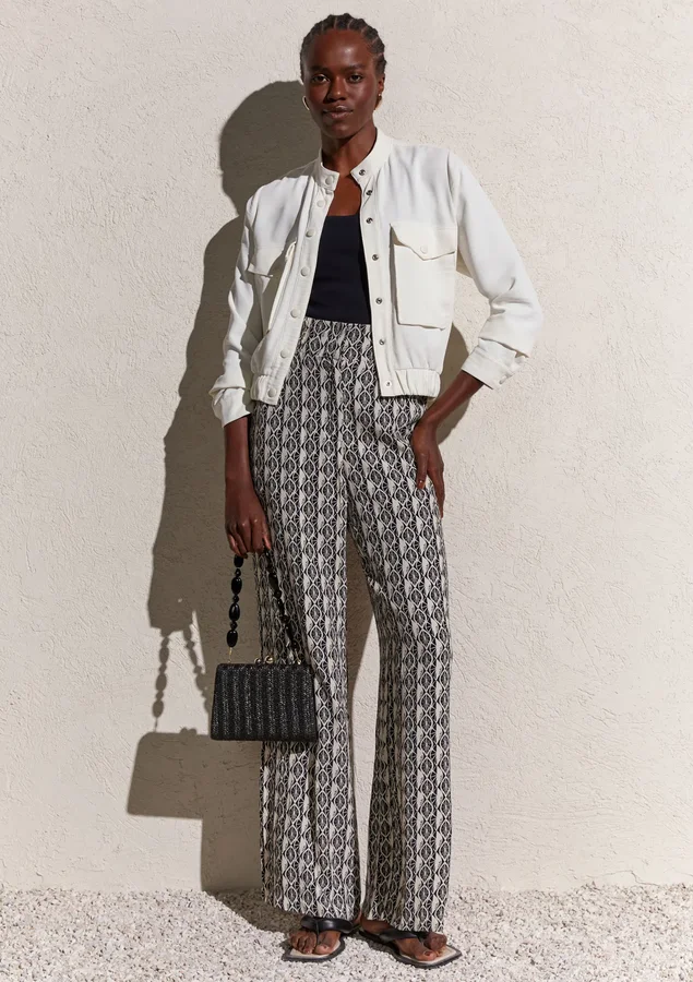 A modelagem reta é clássica e favorecedora, oferecendo um caimento que valoriza sua silhueta, ao mesmo tempo em que proporciona um estilo elegante e atemporal. Comprimento longo é ideal para criar um visual sofisticado em qualquer ocasião. Feita com um tecido de crepe leve, esta calça é suave ao toque e oferece uma sensação agradável de frescor. É perfeito para enfrentar dias mais quentes com conforto. A cintura alta com cós elástico proporciona um ajuste perfeito e confortável, garantindo que você se sinta confiante e confortável o dia todo.