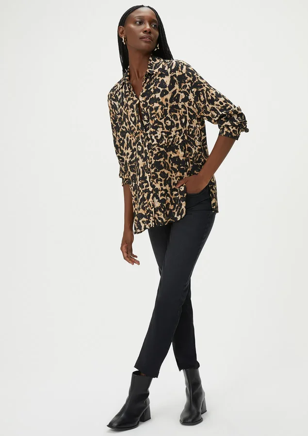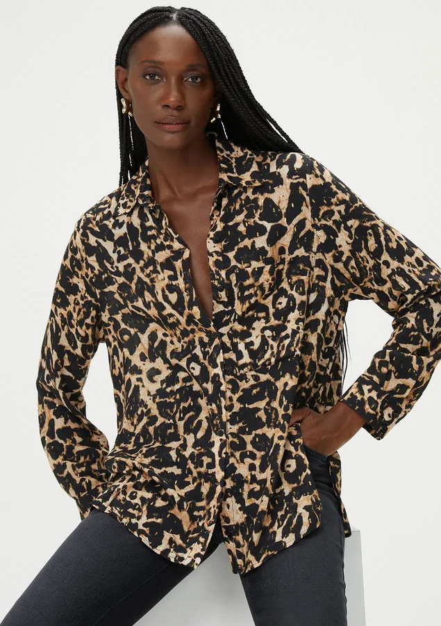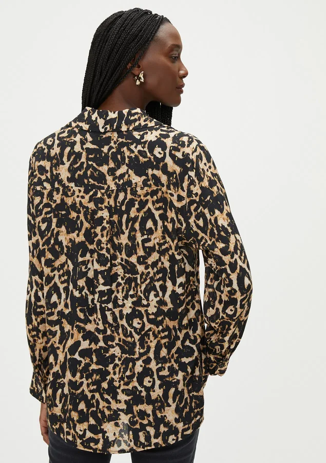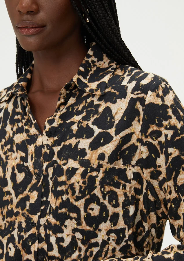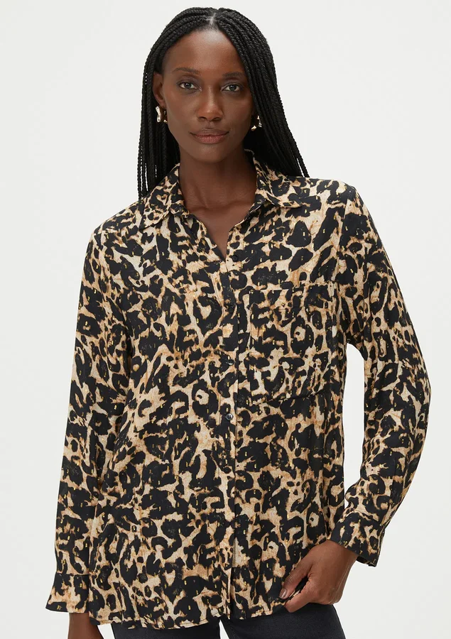 Camisa Comprimento longo, Manga longa, Modelagem ampla, Tecido: Viscose leve com fio metalizado, Fechamento frontal com botões, Bolso frontal, Fendas laterais e Punho com botões.
