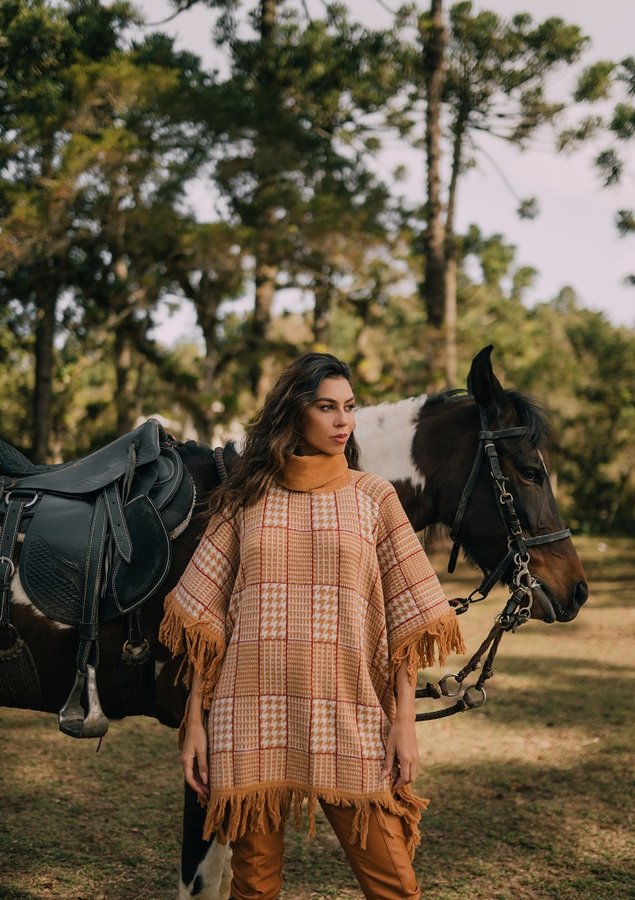 Capa aBenção de modelagem retangular com gola alta e aplicação de franjas nas barras. Modelo com toque aveludado, proporciona atitude aliada ao conforto e aconchego da malha retilínea.
