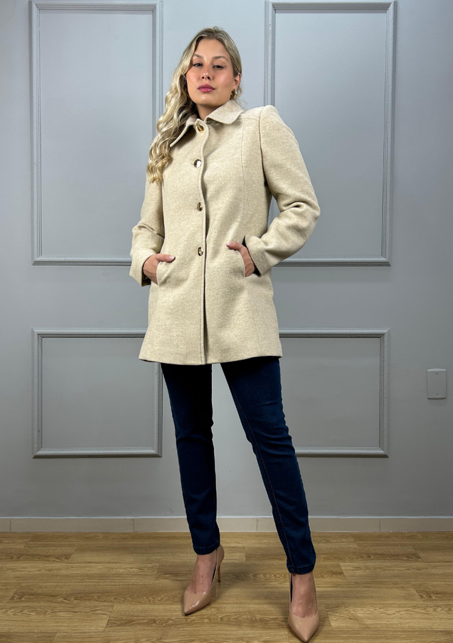 Este casaco feminino combina elegância e modernidade em um design sofisticado. O comprimento médio e a gola clássica oferecem um visual atemporal, enquanto os botões frontais dourados adicionam um toque de luxo. As mangas longas são ideais para manter-se aquecida em dias mais frios, sem perder o estilo.