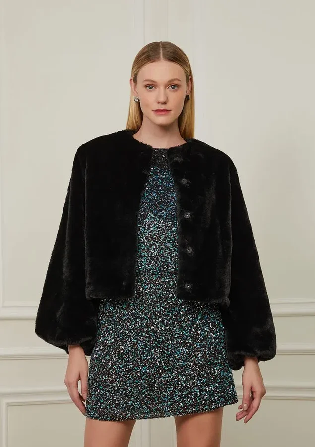 Feito de pelo sintético, modelagem na altura da cintura, com botões de pressão e mangas bufantes.