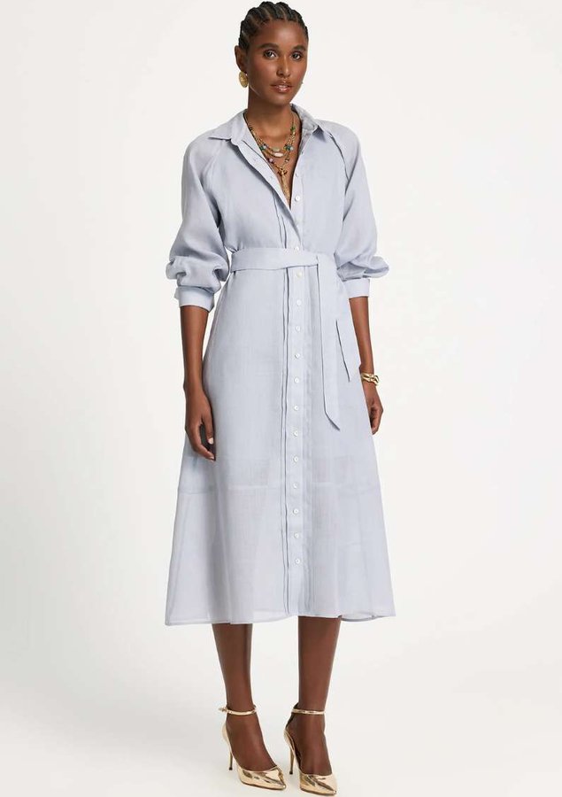 Confeccionada em algodão, a Chemise possui modelagem evasê, colarinho, mangas longas com punhos amplos, vista frontal com abotoamento total, faixa do mesmo tecido para amarração na cintura, comprimento midi e acabamento de barra pespontado.