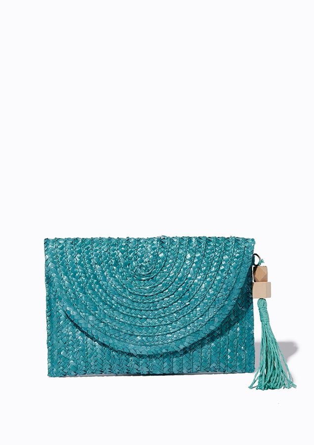 A Clutch é confeccionada em palha com superfície tramada, possui formato retangular, detalhe lateral de tassel aplicado e fechamento por botão de pressão.