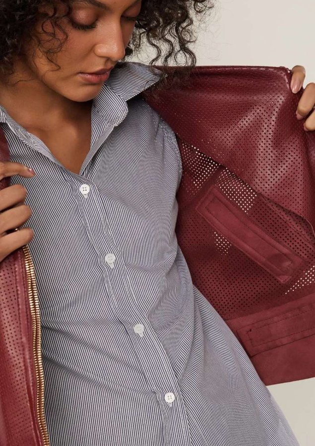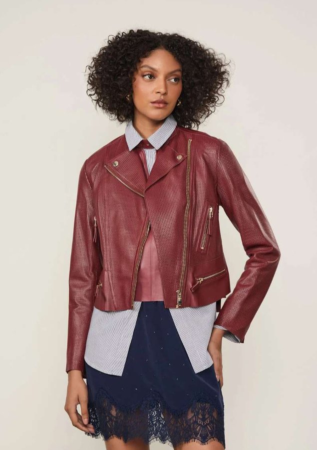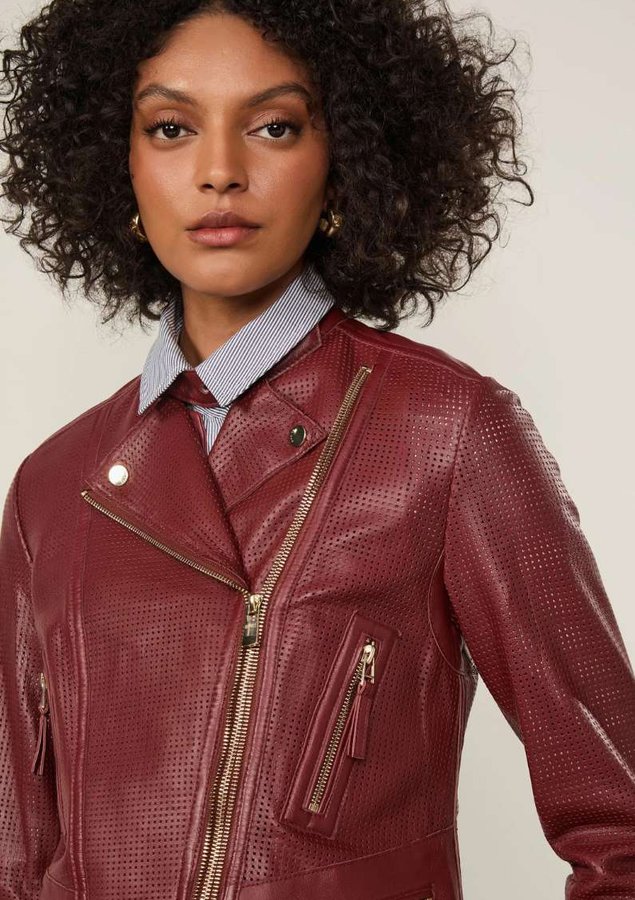 A Jaqueta de Couro Motor apresenta shape slim, bolsos frontais, mangas longas, aviamentos metálicos e recortes pespontados. Uma peça atemporal e autêntica para compor looks contemporâneos com sofisticação.