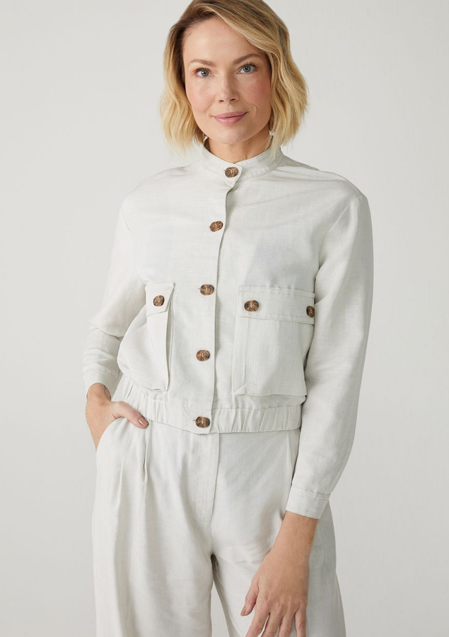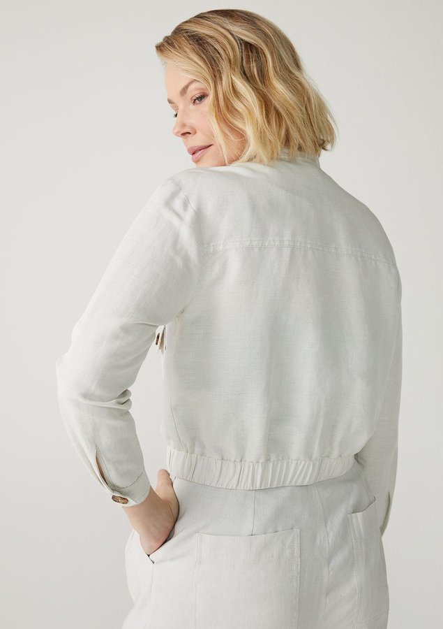 Jaqueta leve, comprimento curto, manga longa, gola alta com botão, punho ajustável e elástico na barra.