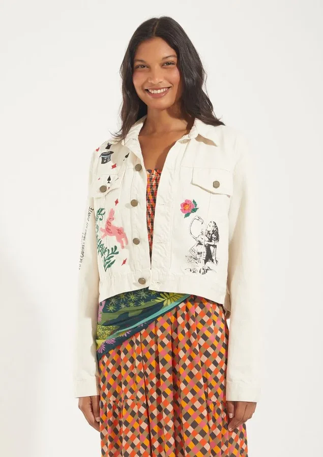 Jaqueta Off-White em Sarja com Bordados, uma peça que combina a sofisticação do design com o conforto da sarja, elevando seu visual a novos patamares de moda. Cada detalhe bordado inspirado em Alice no pais das maravilhas é uma expressão de criatividade que faz dessa jaqueta uma escolha excepcional para quem busca estilo e originalidade.