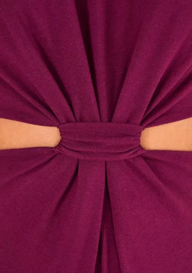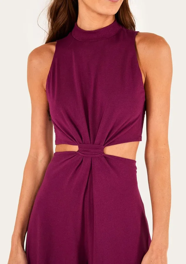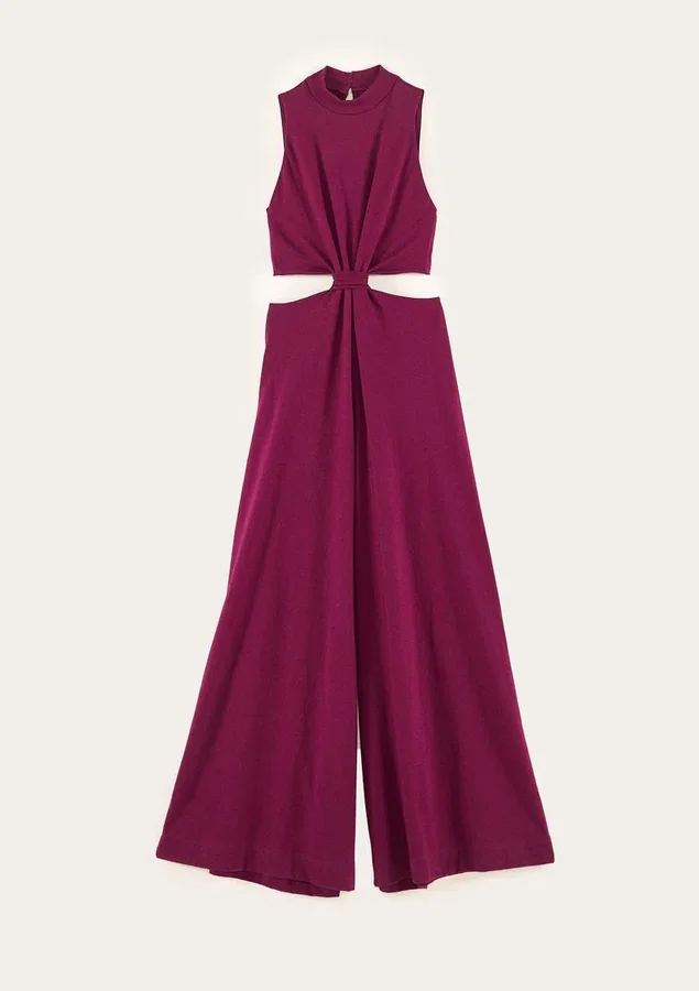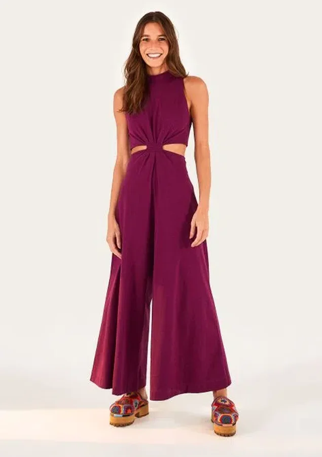 Macacão abertura lateral nó. Possui golinha de ribana, sem manga e com cavão. Tem abertura nas laterais com detalhe de um nó no meio da cintura, unindo o top a parte de baixo e com elástico largo marcando a cintura costas. Tem decote em gota nas costas com detalhe de dois pequenos botões e aselha no alto do decote. O modelo é de malha e tem modelagem de pernas amplas.