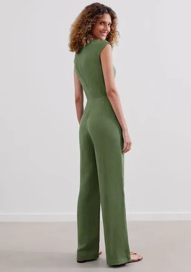 Macacão com decote “V” profundo, efeito torcido no centro da cintura, zíper e acessório em metal.