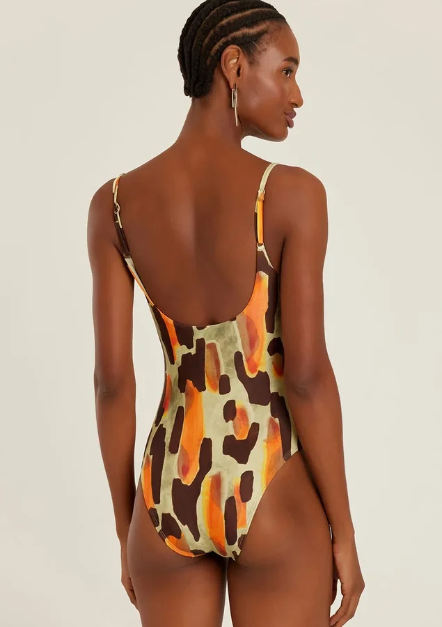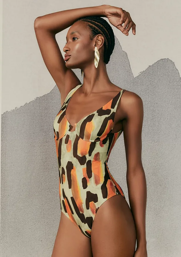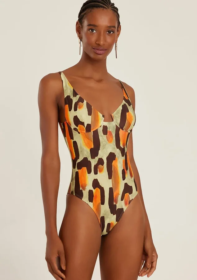 Maiô feminino estampado, modelo meia taça alongado com recorte no busto e alças reguláveis. Lycra com proteção UV FPU 50+. O maiô feminino meia taça traz um toque retrô para o look praia e também transita para ocasiões urbanas.