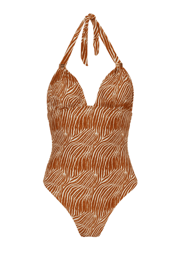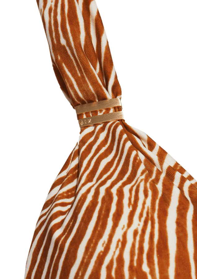 Maio com decote triângulo longo ajustável, tubos de metal vazado nas alças, recorte abaixo do busto, amarração no pescoço, bojo removível e cobertura grande.