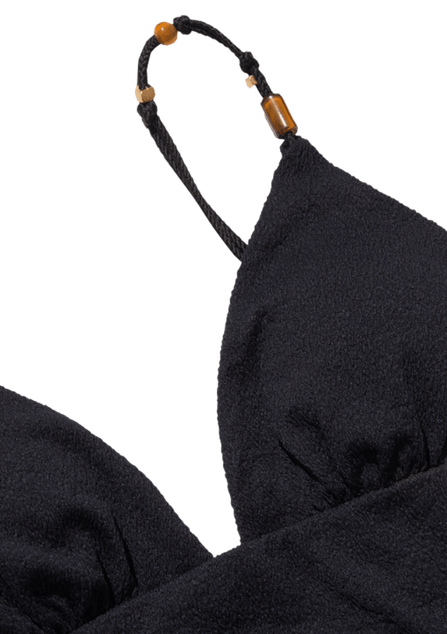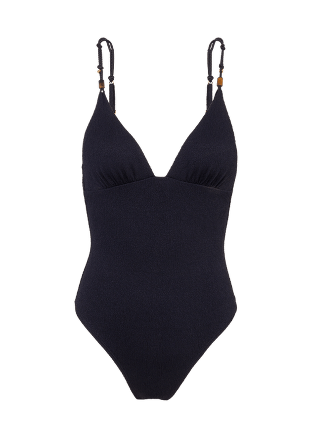 Maio com recorte abaixo do busto, shape triângulo na parte do top e alças paralelas reguláveis em corda elástica na mesma cor do tecido, com detalhes em metal e resina tartaruga. Bojo removível e cobertura grande.