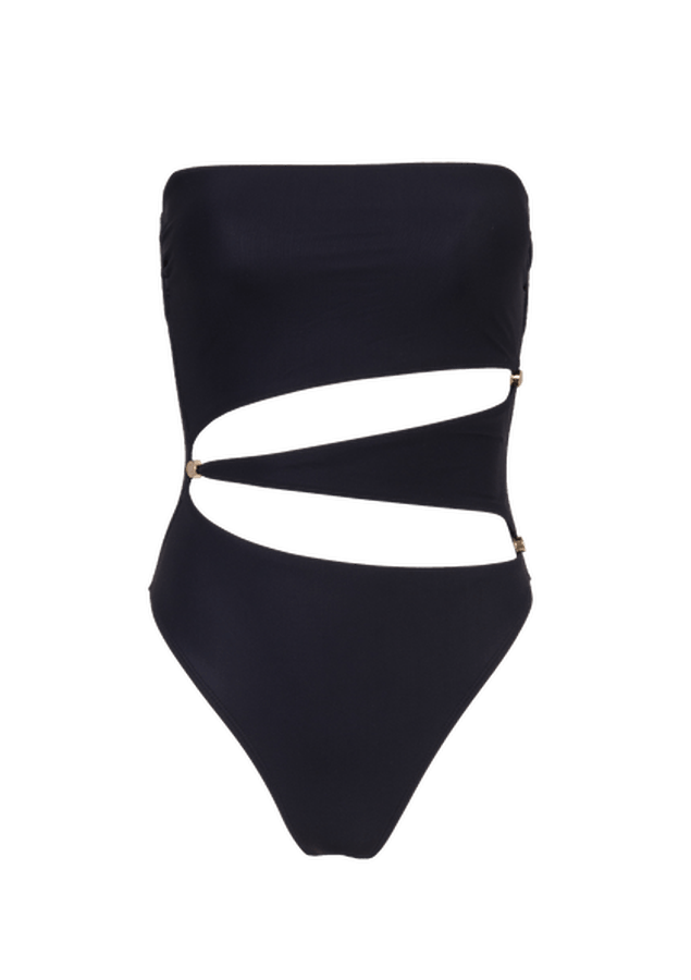 Maiô shape “tomara que caia” sem decote com duas aberturas geométricas de ponta a ponta, do lado esquerdo ao direto, na parte frontal da peça, arrematadas por detalhes em metal nas extremidades. Alcinhas removíveis e reguláveis, Cobertura grande. Todos os metais dos sofisticados aviamentos ViX têm banho de ouro.