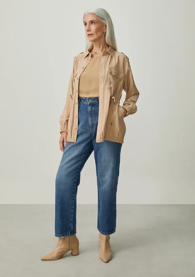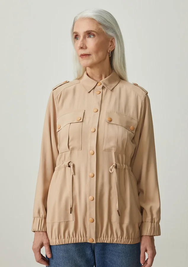 A parka é uma peça versátil e elegante, com sua modelagem reta, comprimento médio e manga longa em tecido de alfaiataria fluida lavada. Os bolsos utilitários e o fechamento frontal com botões de metal adicionam um toque prático e estiloso. Além disso, o ajuste na cintura, o elástico no punho e na barra, juntamente com a cintura regulável com enforcador, oferecem opções de personalização para um look que se adapta ao seu estilo. Parece ser uma peça muito versátil e cheia de bossa!