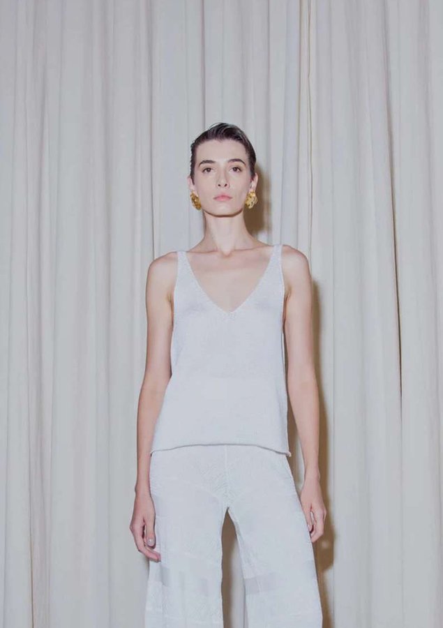 A Regata em Tricot VF Essencial é produzida com o fio de torção de Vortex com Rayon. A peça possui decote V, alças finas e modelagem despojada. Perfeita com calças, shorts e saias.
