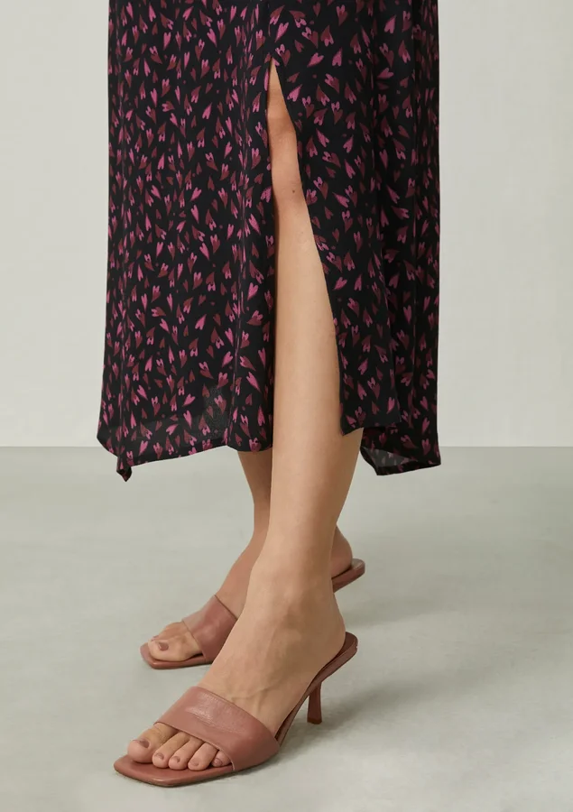 O fechamento lateral com zíper invisível e colchete garante um ajuste perfeito e discreto, enquanto o cós com elástico proporciona conforto adicional e facilidade de movimento. A fenda frontal adiciona um toque de ousadia e estilo, elevando o visual da saia para o próximo nível.