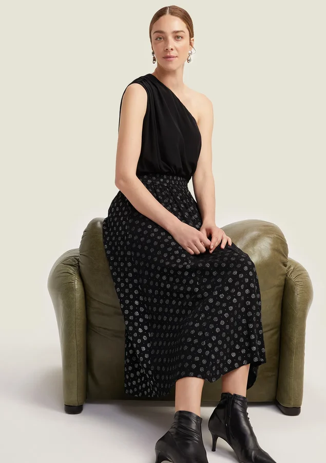 Saia Comprimento longuete, Cintura alta, Modelagem evasê, Tecido: viscose texturizada, Elástico no cós, Forro interno.