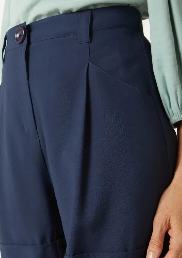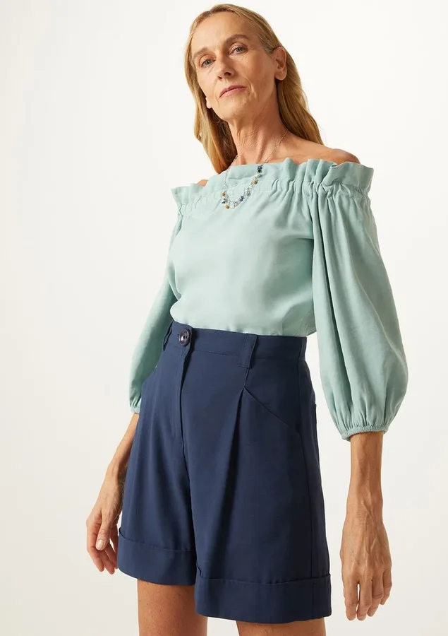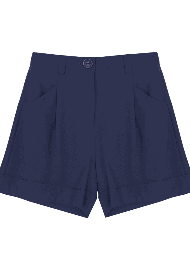 Shorts Comprimento curto, Cintura alta, Modelagem alfaiatado, Fechamento de zíper com botão, Bolsos laterais e costas
