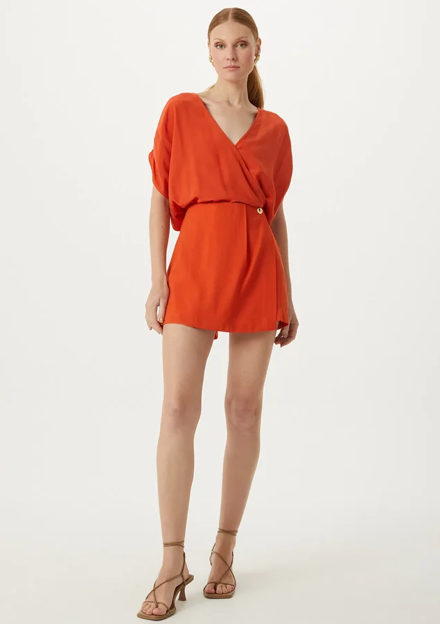 Shorts Comprimento curto, Cintura alta, Modelagem evasê, Transpasse de saia na frente, Prega na frente, Abotoamento com botão de metal dourado, Bolso nas costas.