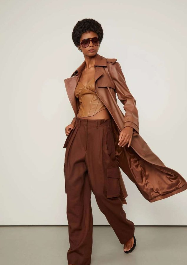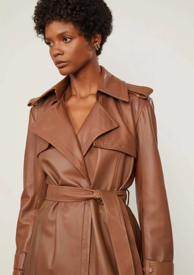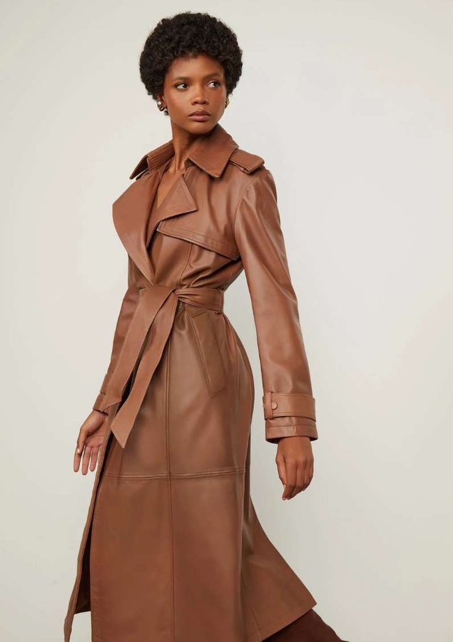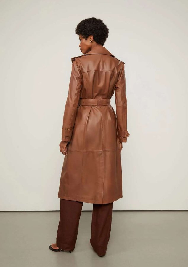 O casaco marrom é confeccionado em couro sem elasticidade. A peça de modelo trench coat solta ao corpo possui lapela, colarinho aplicado, mangas longas, passantes e martingales aplicados na altura dos ombros e nos punhos, recortes posteriores e frontais, fenda posterior, forro, bolsos frontais embutidos, comprimento alongado, passantes na altura da cintura na parte posterior e não possui fechamento.