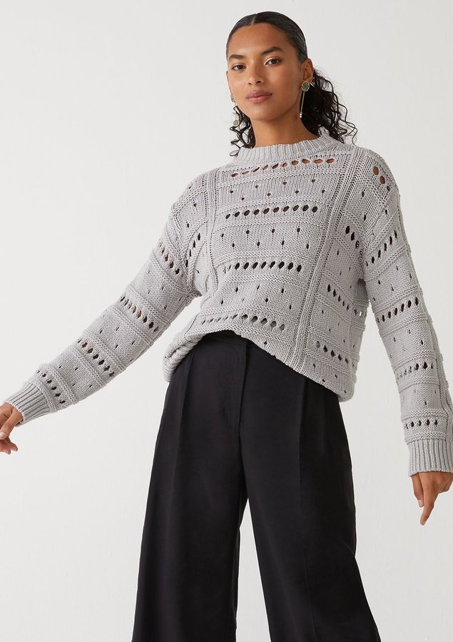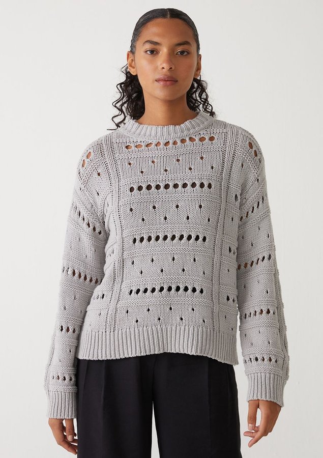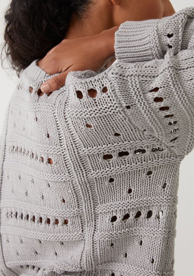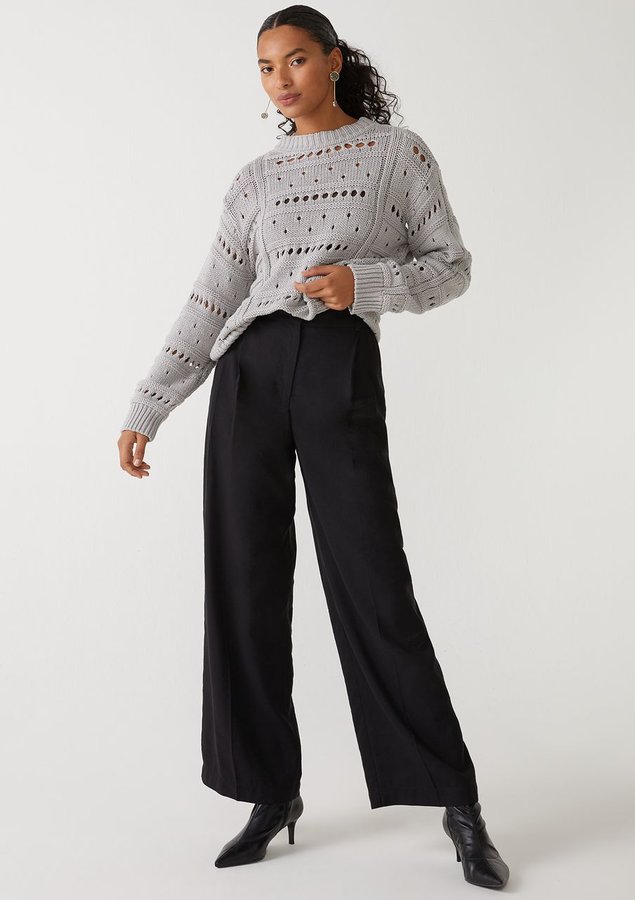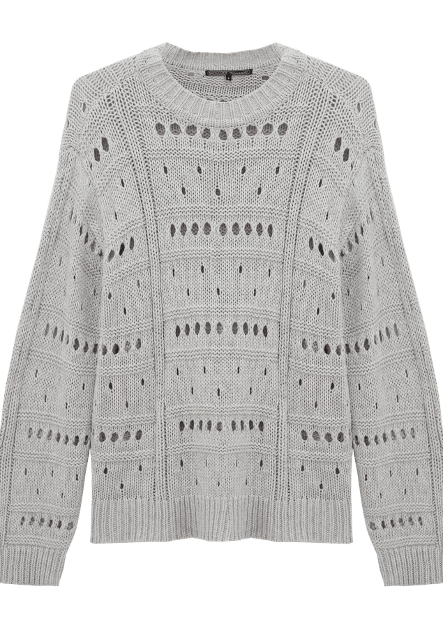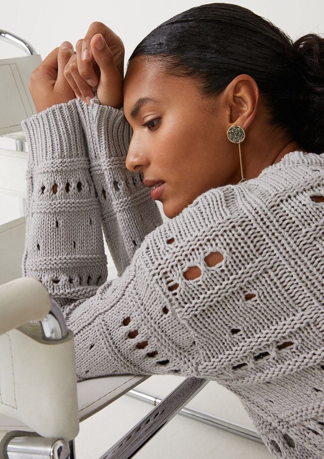 Blusa comprimento médio, manga longa, modelagem ampla, decote redondo alto e toque macio.