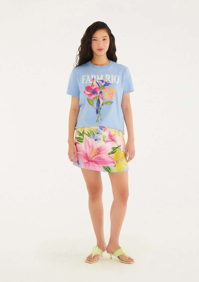 T-shirt fit flores passarinho farm rio. com modelagem clássica e toque macio, esta peça é um convite ao frescor. apresenta decote redondo e mangas curtas que promovem conforto para diferentes ocasiões. a estampa exuberante traz vida e destaca a originalidade e o estilo único da marca. perfeita para um visual casual e encantador no dia a dia.