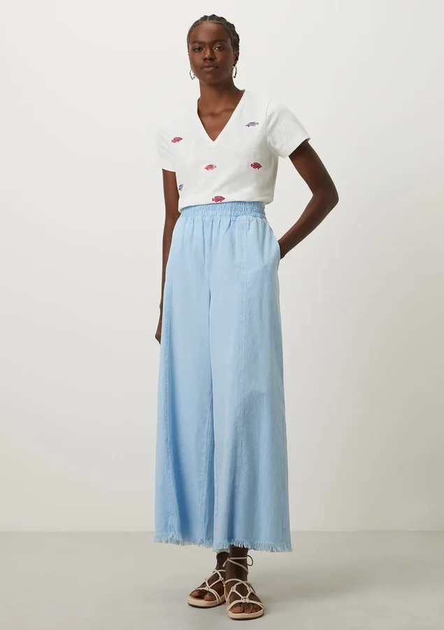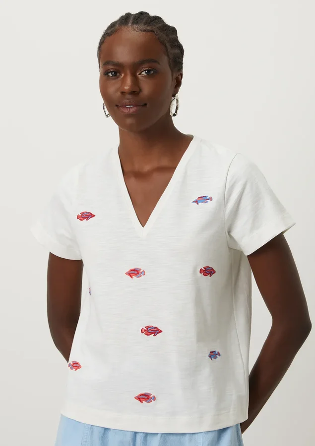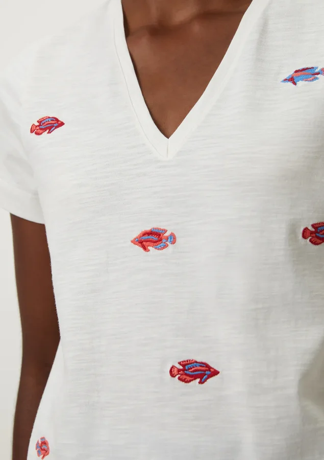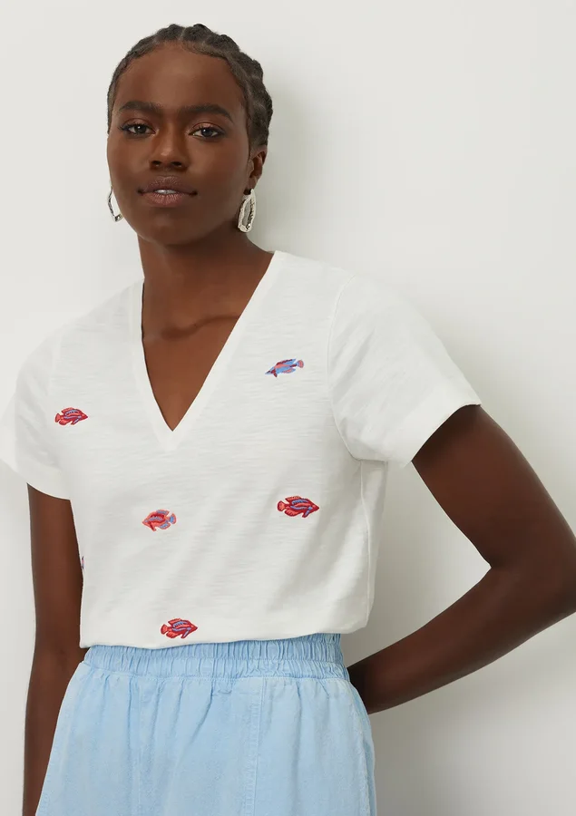 O decote em V adiciona um toque de elegância, destacando o colo de maneira sutil. O diferencial fica por conta dos mini peixes bordados na frente da peça, conferindo um charme único e um toque de personalidade à camiseta.