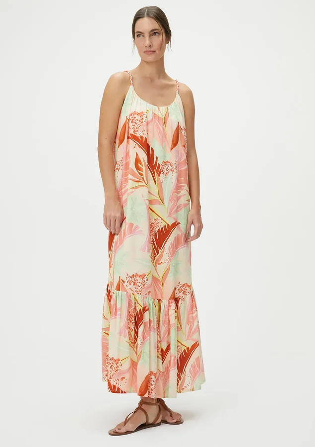 Vestido midi, uma peça versátil e elegante que combina estilo contemporâneo com conforto inigualável. A modelagem evasê proporciona um caimento fluído, destacando a feminilidade de maneira sutil. As alças finas e o decote redondo adicionam um toque delicado, tornando-o ideal para diversas ocasiões.