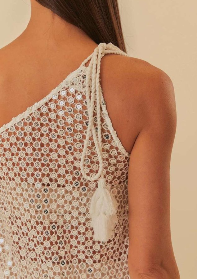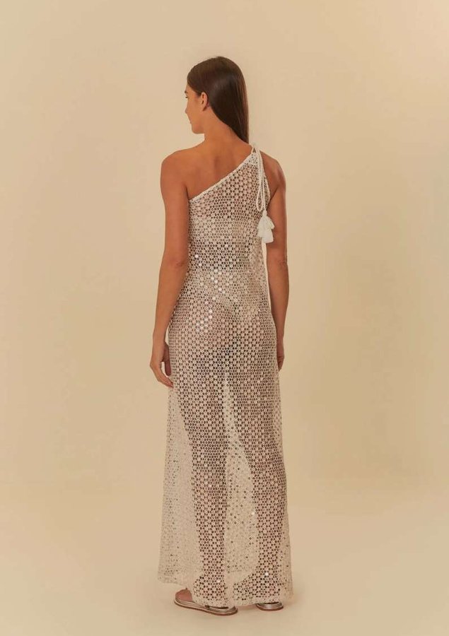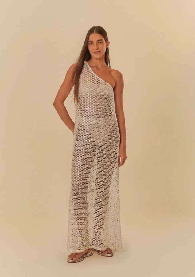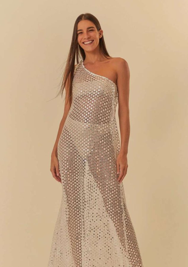 Vestido artesanal brilho. com um ombro só, o modelo esbanja charme e versatilidade. produzido em tecido leve, o vestido apresenta acabamento refinado com fios dourados que iluminam a peça. ideal para eventos ao ar livre ou um jantar especial. esta é uma peça exclusiva da coleção FARM RIO original - alto verão 25.