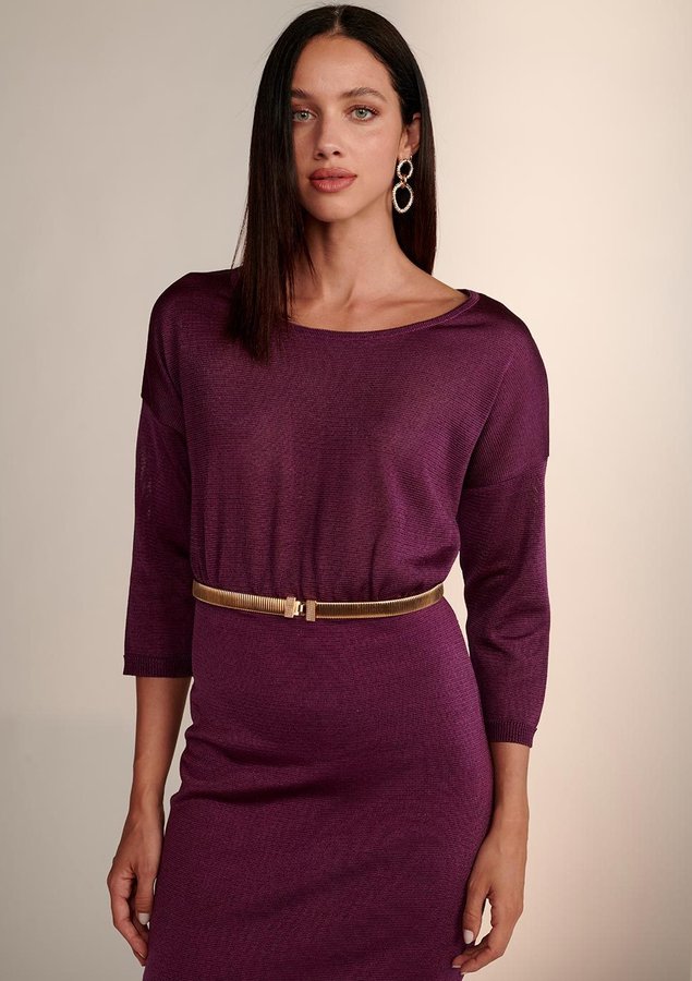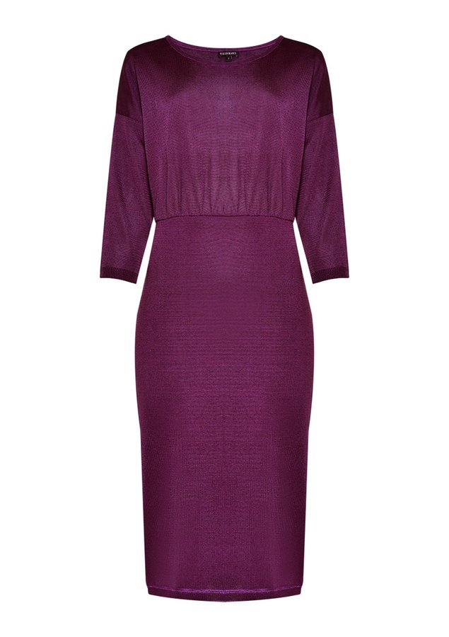 O Vestido é confeccionado em tricot, possui caimento acinturado, gola redonda, mangas 3/4, cintura com recorte e detalhe franzido, comprimento midi e acabamento pespontado.